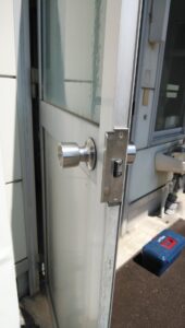 こちらは安佐北区口田南の事務所出入口の錠前で壊れています 施錠してもノブを触っていたら鍵がなくても開きます ケースが壊れています(GOAL GF) 防犯性も考慮してU9HMDを取り付けて完了です。
